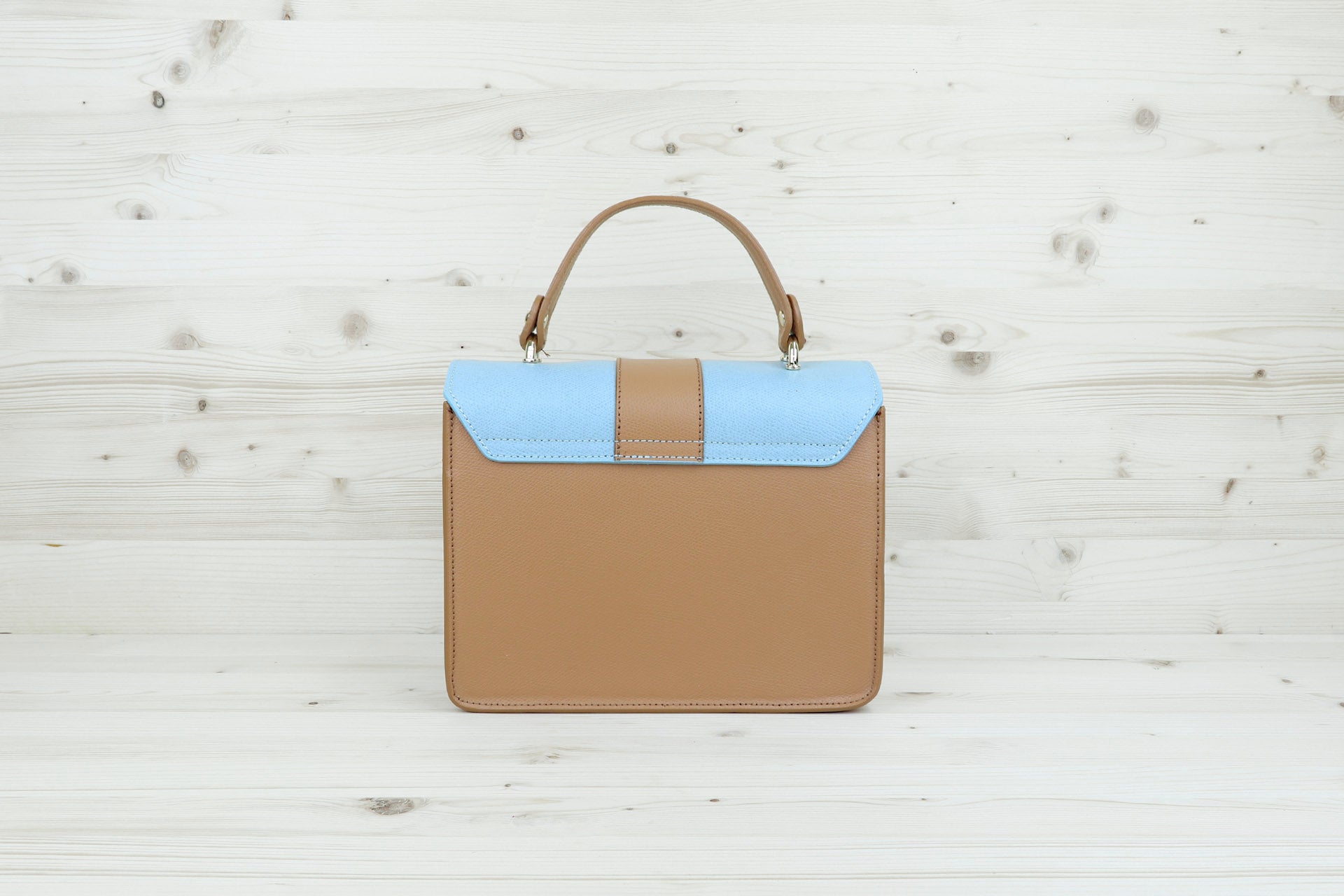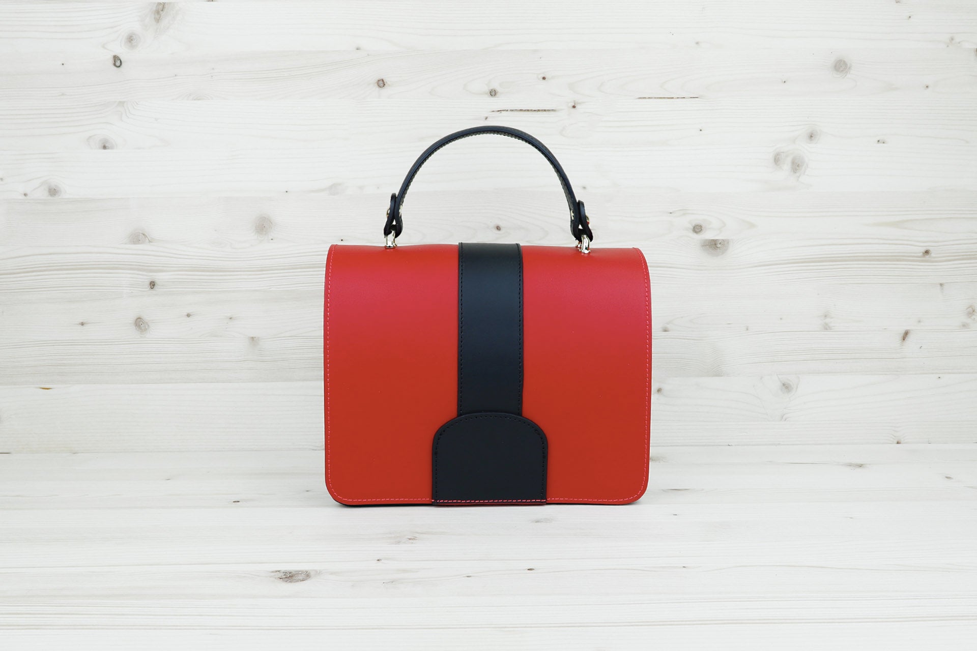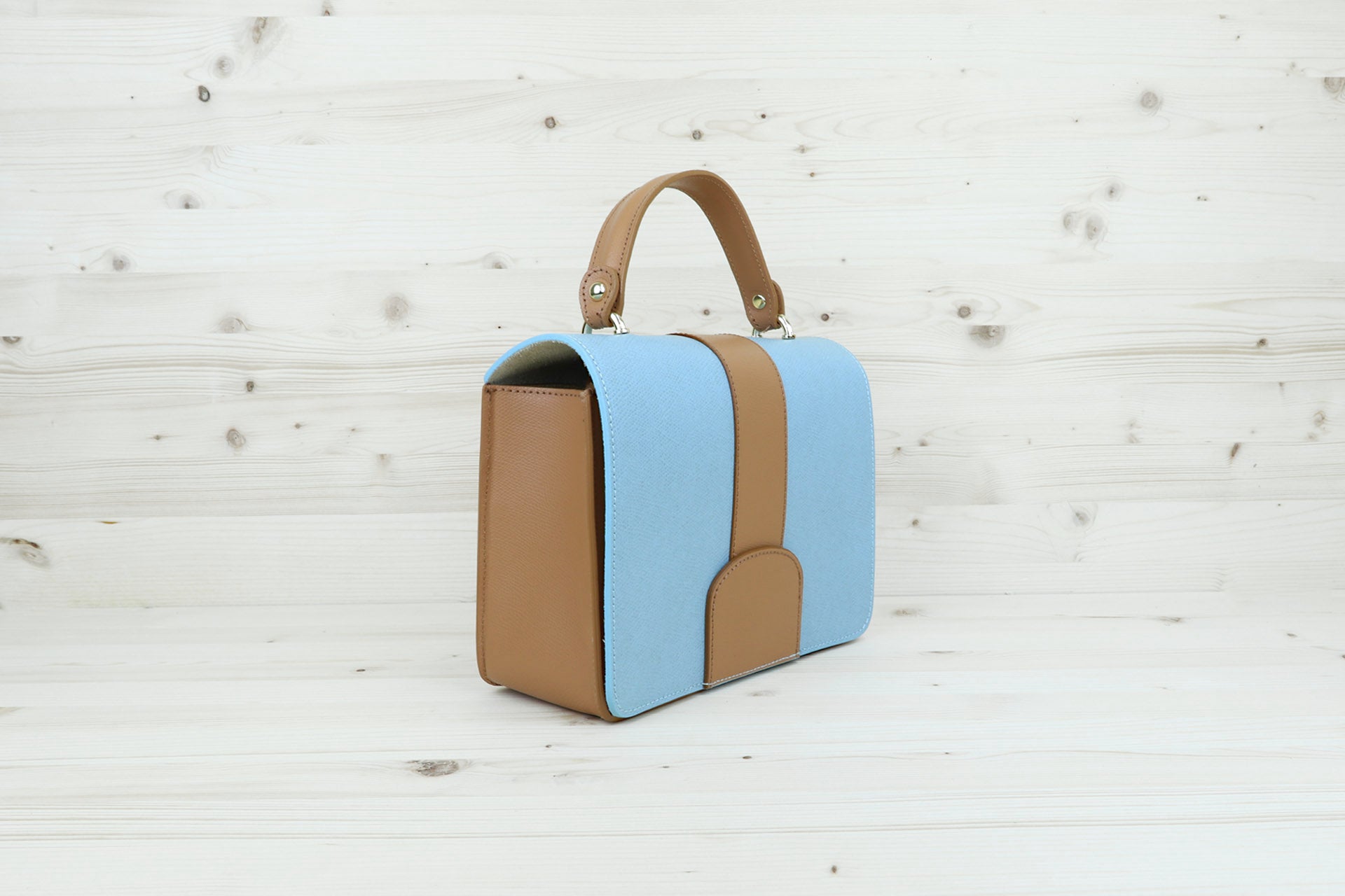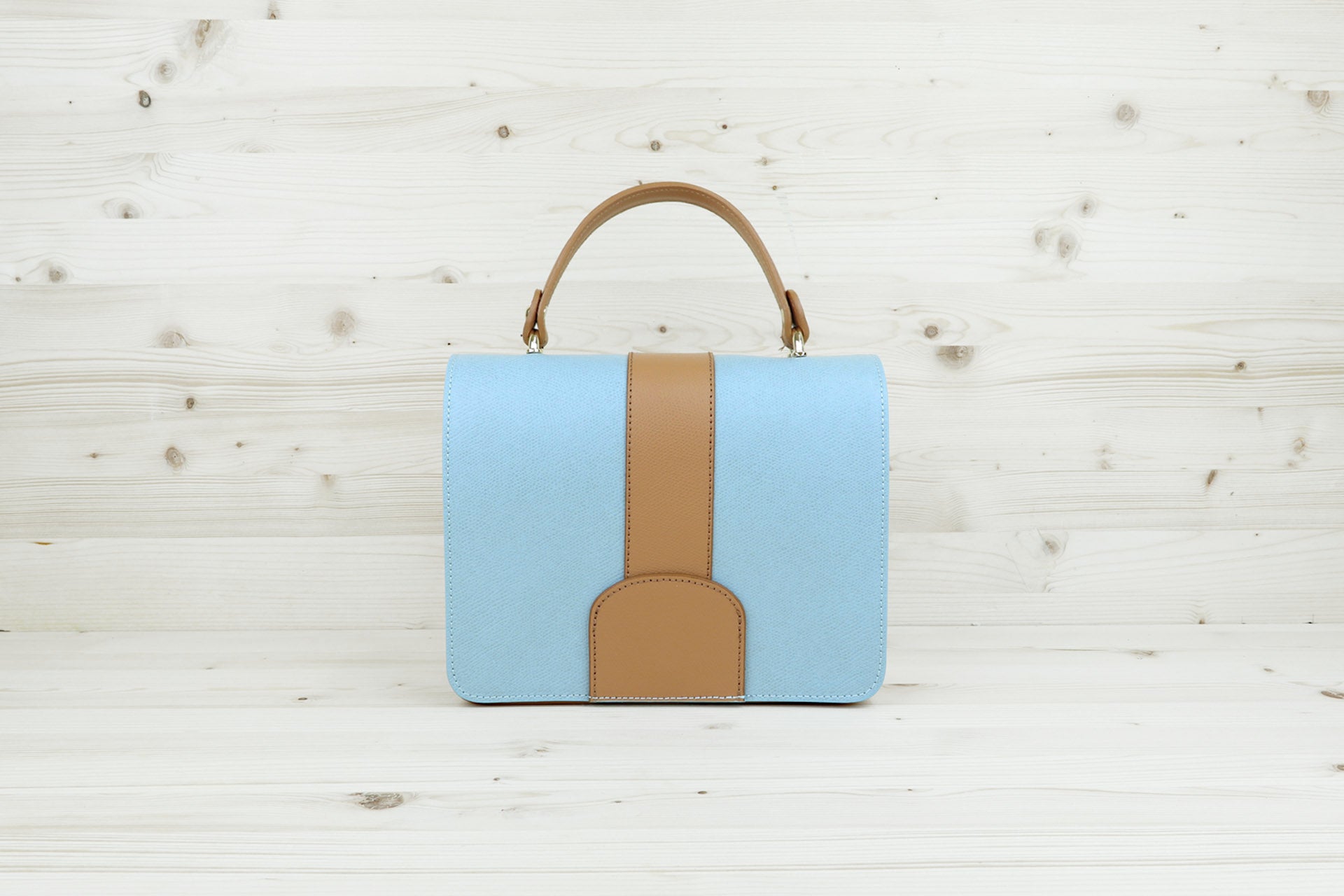 Small format structured handbag, with rigid handle. The flap covers the entire height of the bag, has a decoration applied in a chromatic contrast, is fixed to the body of the bag using a clip button. Inside, unlined with a textured finish, there is a pocket. The flap inside is covered with a suede finish. The model is equipped with an adjustable and removable shoulder strap to also be worn cross-body.