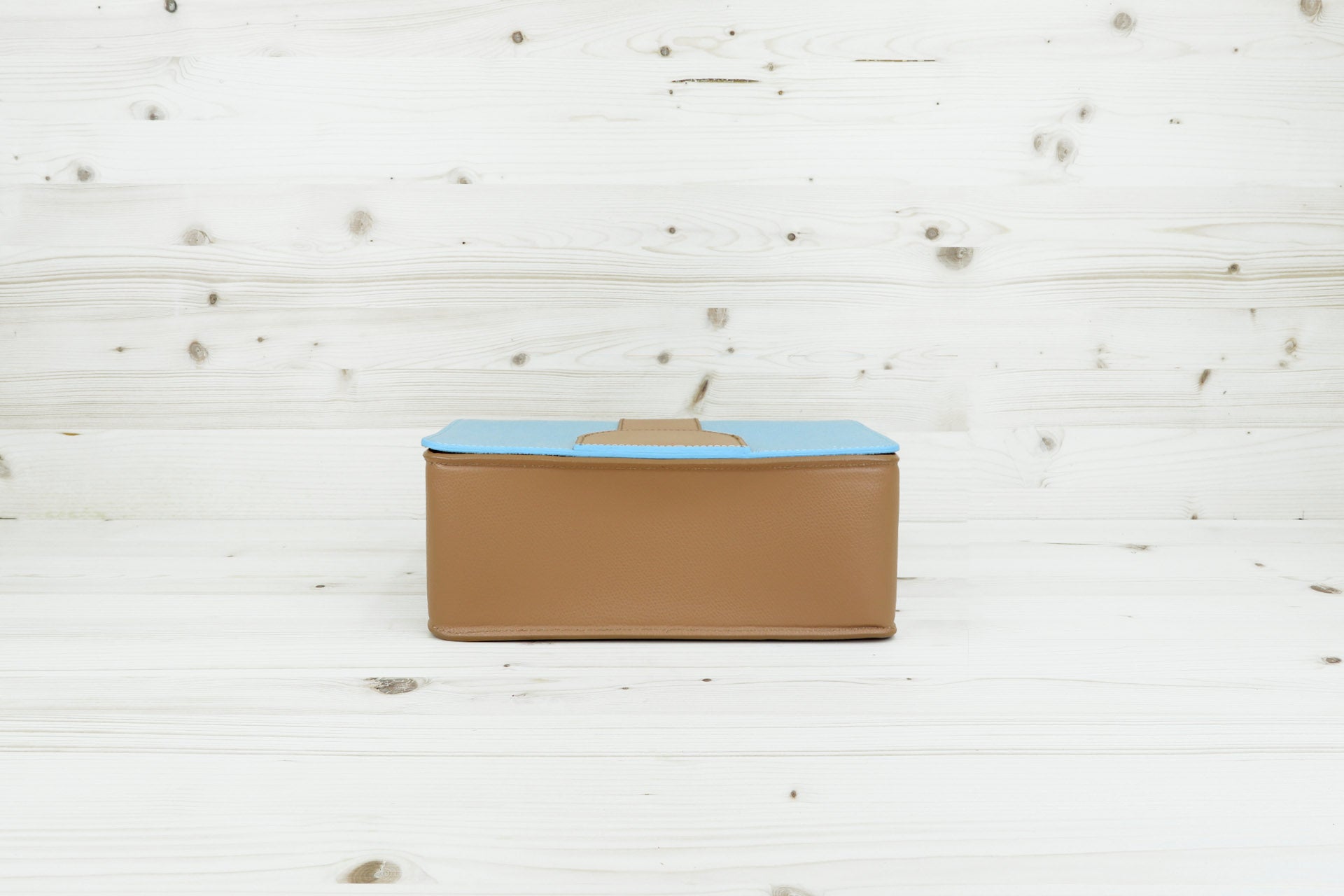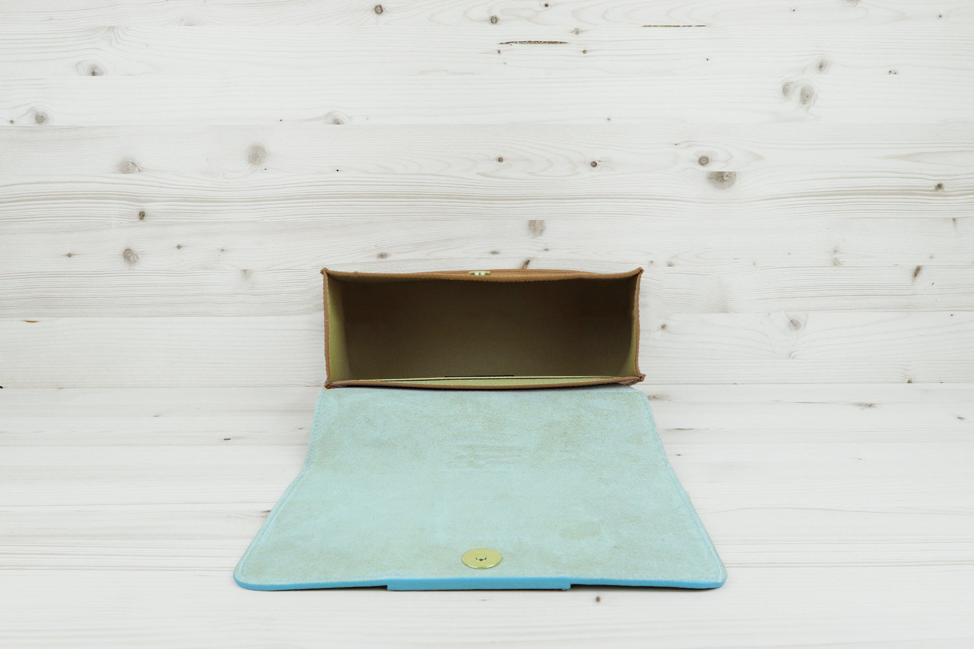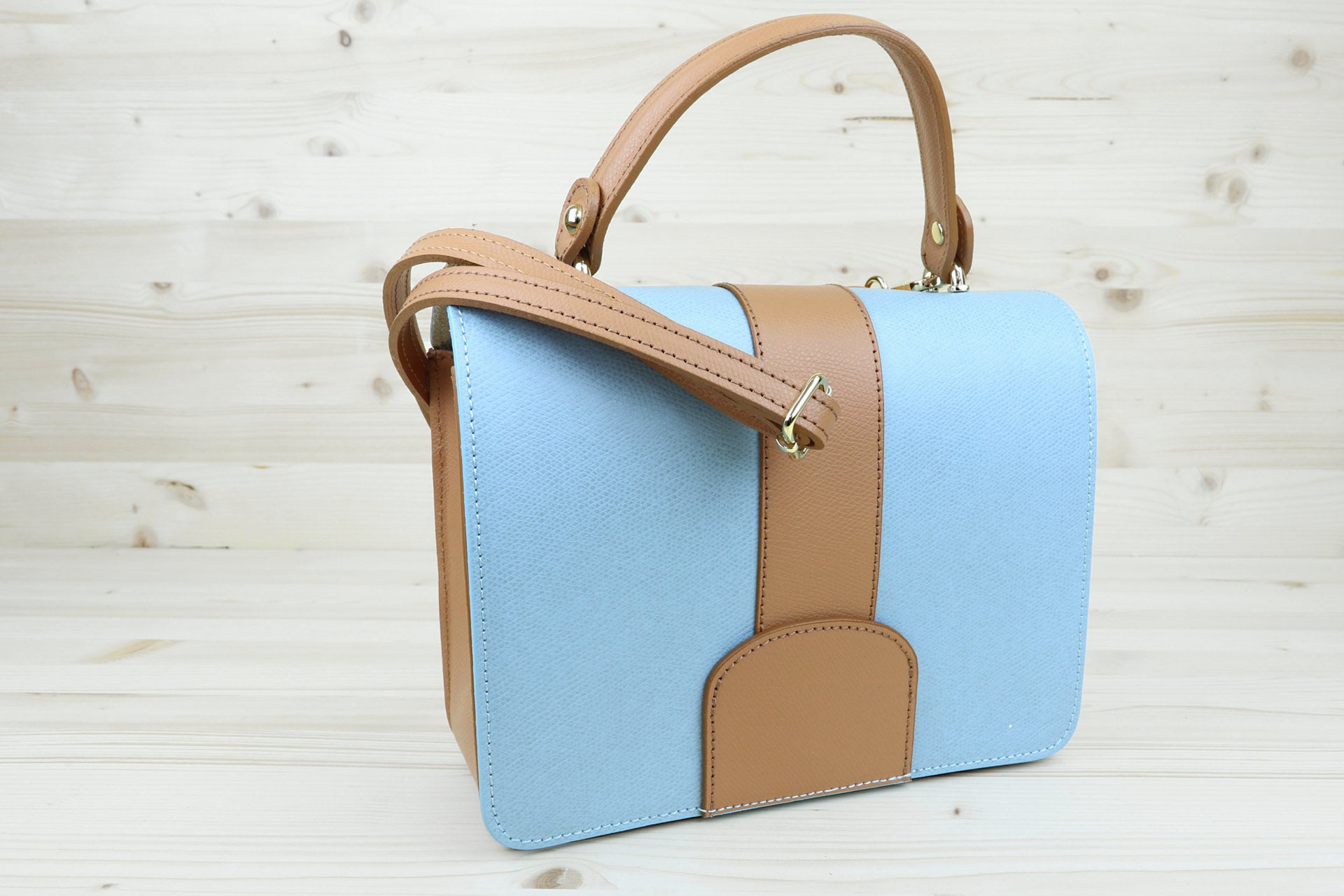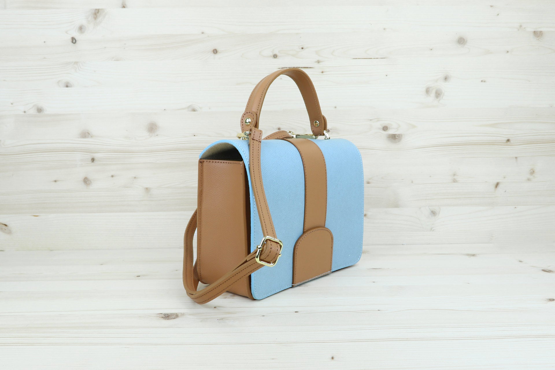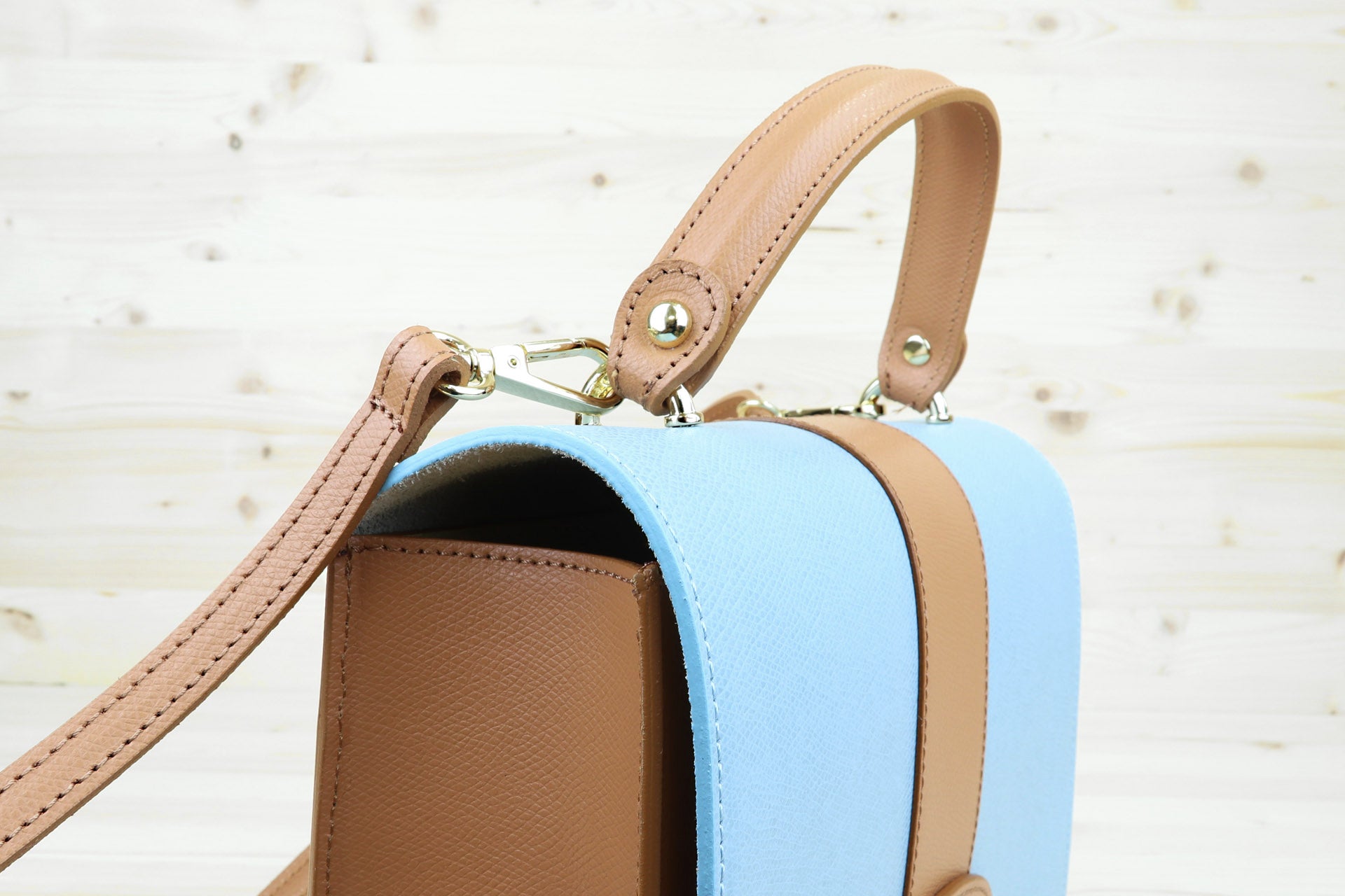 Small format structured handbag, with rigid handle. The flap covers the entire height of the bag, has a decoration applied in a chromatic contrast, is fixed to the body of the bag using a clip button. Inside, unlined with a textured finish, there is a pocket. The flap inside is covered with a suede finish. The model is equipped with an adjustable and removable shoulder strap to also be worn cross-body.